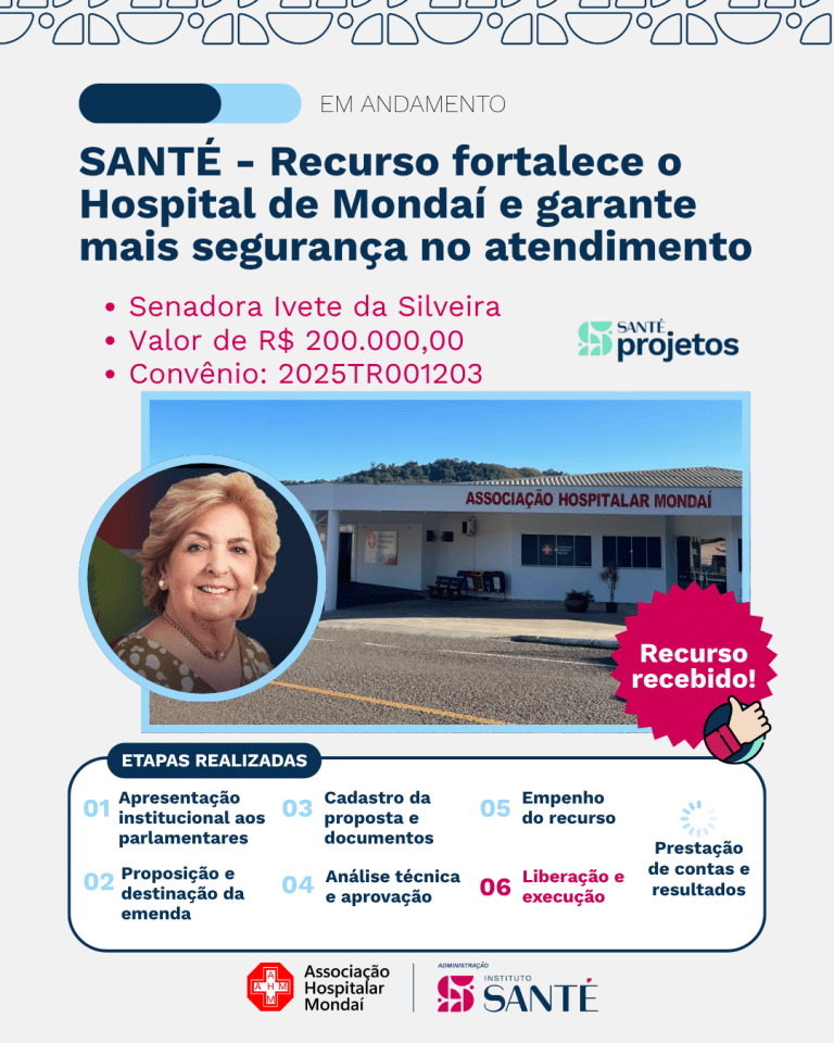 O Hospital de Mondaí, administrado pelo Instituto Santé, recebeu uma emenda parlamentar individual de R$ 200 mil, destinada pela senadora Ivete da Silveira. O recurso foi aplicado em despesas operacionais essenciais, o que proporcionou equilíbrio