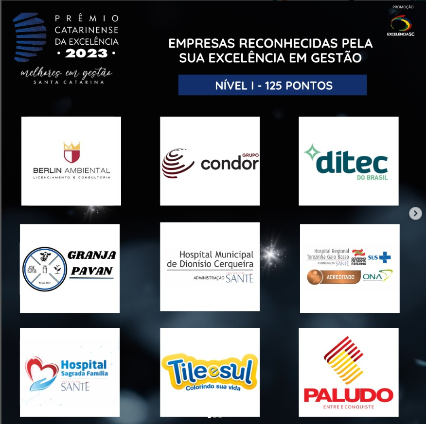 O Hospital Regional Terezinha Gaio Basso de São Miguel do Oeste, o Hospital Municipal de Dionísio Cerqueira e o Hospital Sagrada Família de Itapiranga recebem no dia 30 de novembro, em Florianópolis, o Prêmio Catarinense da Excelência por terem se destacado na implementação de ferramentas de gestão alinhadas ao Modelo de Excelência na Gestão (MEG). As três unidades contam com a gestão do Instituto Santé e estão na categoria Nível I – 125 Pontos.